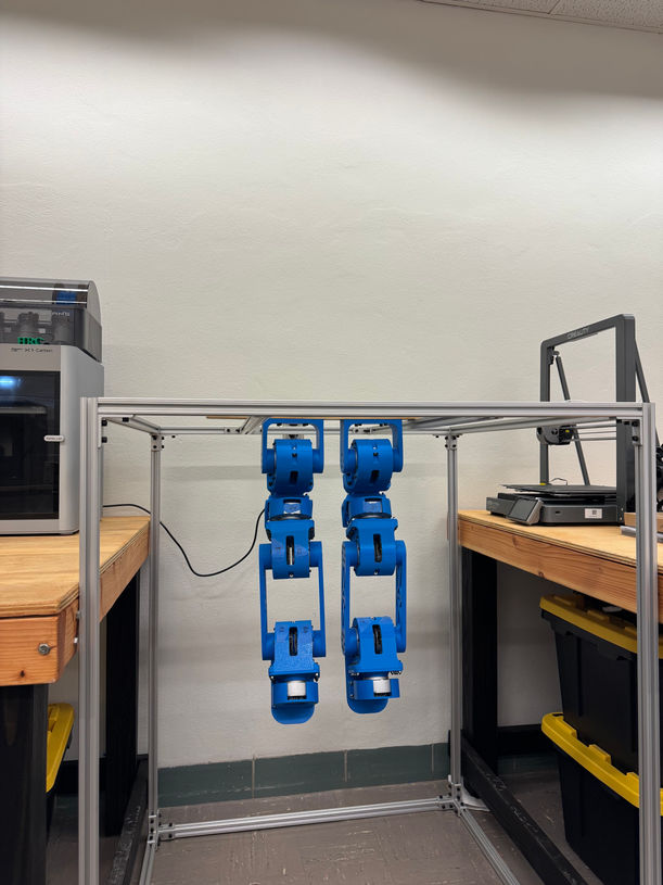 Legs have direct-drive linkages. They walk in simulations, now we're testing in real life. Also manufacturing the 3D printed parts in Aluminum now.